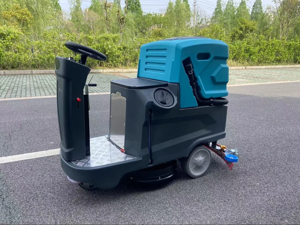 Compact ride-on scrubber dryer designed for large commercial areas requiring fast and operator-friendly cleaning